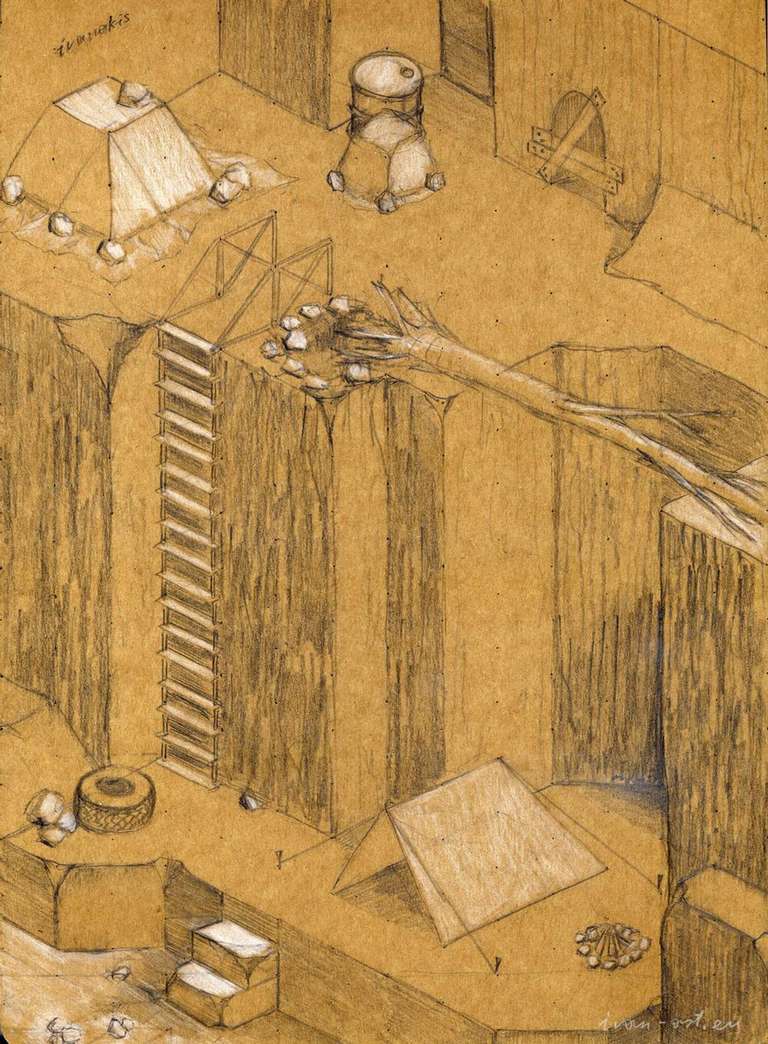 Изометричната графика е вид нереална перспектива, която ни позволява да разполагаме триизмерни обекти, но без да имаме точки на хоризонта, към които обектите или техните страни да се смаляват. При изометричната перспектива всички обекти изглеждат все едно се намират на еднакво разстояние от нас. Беше много популярна по времето, когато всички искаха триизмерни компютърни игри, но хардуера нямаше универсално 3D ускорение и се използваха всякакви трикове. За да постигнем този ефект имаме нужда от хартия, която е предварително разграфена на ромбове - можете да забележите точките на фона, всеки четири от тях образуват ромб. Ако желаете да експериментирате, лесно може да намерите готов шаблон за принтиране като потърсите в интернет за "isometric dot paper". Изометричната перспектива има един минус - не може да нарисувате небе, понеже погледът е насочен винаги към земята. Освен ако няма облаци по-ниски от земята, хм ...